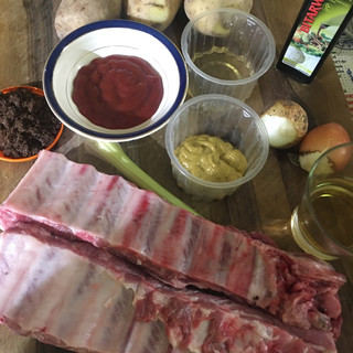 Desgrasar las ribs y llevarla al horno (si quieren a la parrilla mucho mejor) por 1 hora y media tapado con aluminio.