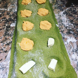Para el armado, en primer lugar estire la masa hasta 6 de la máquina, luego en la sorrentinera puse un poco harina y la masa arriba, un cachito de queso y relleno y luego pintar los bordes con agua y poner la masa arriba. Por último pasar el palo de amasar arriba hasta cortar la masa, desmoldar y dejar sobre la mesada enharinada. Hervirlos en abundante agua por 2 minutos.